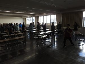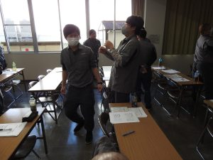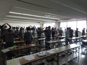 転倒予防のための効果的なストレッチやトレーニング方法を学びます。現場で体を動かしている従業員のみなさんも普段使わない筋肉を使うためか気持ち良さそうにストレッチを実践していました。
